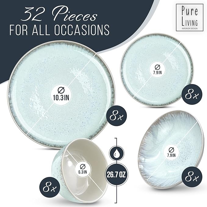 32 Piece Dinnerware Sets for 8 - Mediterranean Stoneware Dinnerware Set - Microwave Safe Dinner Plates and Bowls Sets for 8, Ceramic Dish Set, Bowl and Plate Sets for 8, Beige Blue Dishes Set for 8