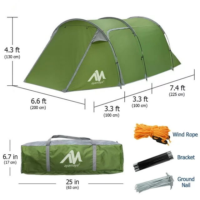 Specification Tent Size: 14ft x 6.6ft x 4.3ft Sleeping Room Size: 7.4ft x 6.6ft x 4.3ft Material: Made of upgraded 190T polyester and PU2500 special waterproof coating Weight: 11.3lb Capacity: 4/5 Person Layers: Double Season: 4 Season 2 Rooms: One-bedroom and One-living room Multiple Doors: More convenient and more ventilated Application: Camping, backpacking, travel, hiking, mountaineering, survival, fishing, outing