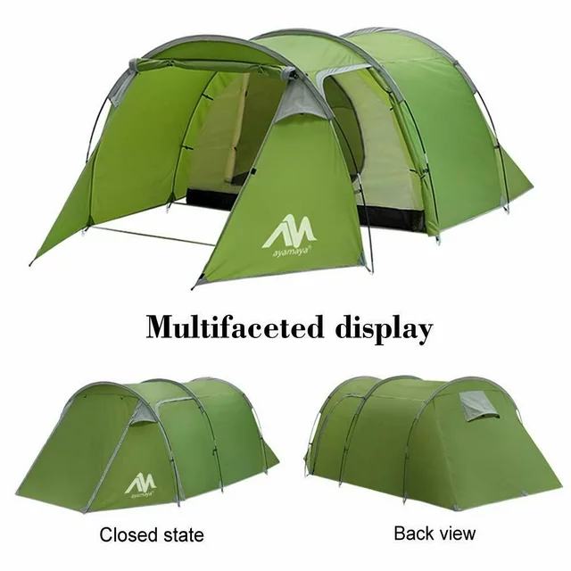Features [2 DOOR VESTIBULE] - The bike tent offers 2 doors in the vestibule to provide excellent ventilation, there are two vents in the front door corner, so you won't feel stuffy even without the door open. And the vestibule in front is a wonderful storage space, you can store your shoes or some other things under it to the left and right side of the door and have enough room for a dog to join you. [Waterproof] - The waterproof tent consists of 2 functional layers, the liner is made of B3 mesh and 190T breathable Polyester, the outer tent is made of 210T Rip-stop Polyester, it has passed the waterproof test with a rating above 3000mm, offers high performance in extreme weather conditions. [ROOMY ENOUGH FOR 4-5 PERSONS] - The size of the entire camping tent is 14ft x 6.6ft x 4.3ft, the sleeping area is 7.4ft x 6.6ft x 4.3ft, it can accommodate up to 4-5 people, the vestibule is 6.6ft x 6.6ft x 4.3ft, the spacious space enlarges your activity area and storage area. [UPGRADE FIBERGLASS] - 3 shock-absorbing poles can support most heavy wind rain and snow. Stay secure. [D-STYLE MESH DOOR] - Inner tent has a large 2-way zipper D-style door with full mosquito mesh protection and improved ventilation. Front and D-shaped side doors allow you to enter or return without crossing over your partner. [EASY SETUP] - The setup of this tunnel tent is easy and fast, insert the 3 shock-absorbing poles into each sleeve, then fix them with tent stakes, the outer tent is set up, then hang on the inner tent, the setup is finished, it could be done within 5minutes by just one person.
