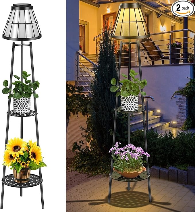 ☀【UPGRADED SOLAR FLOOR LAMP】Unlike other solar floor lamp that only have one layer of plant shelves or none, our upgraded 45.5" lights features a double layer of plant shelves, so you can put your favorite flowers or books on the shelves. then place solar lamp on patio, porch, deck, garden to add beautiful. The style is modern and simple, compact and delicate. landscape lighting to creates a romantic atmosphere for your home. Extremely pretty solar powered outdoor