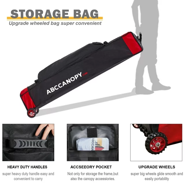 Make outdoor events even more fun with this ABCCANOPY 10' x 10' Commercial Canopy with Sidewalls. It has folding white powder coated frame. Easy to set up in seconds, structure very stable. Improved thumb button comer slider for quick lock and safely take it down. The top is made with100% heavy duty poly taff. Fabric can block 99%UV, and it is also waterproof, so this fabric offer you to use it all seasons no matter rainy or sunny days. And it has convenient signature carrying bag. The big have new design and bigger stronger wheels. so it never afraid to transport to any event, market parties.