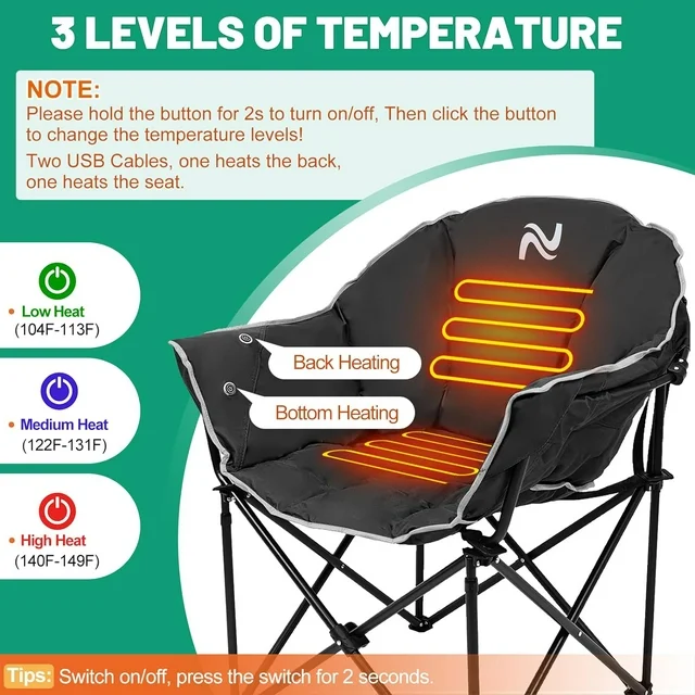 Heat System: The battery heated camping chair quickly warms up both your back and seat (???????? ?????????????? ??????????). Featured with 3 different Heat Mode [Green Light (Low)/Blue Light (Medium)/Red Light (High)] up to 131℉/55℃ that can keep you warm for hours during the cold season.