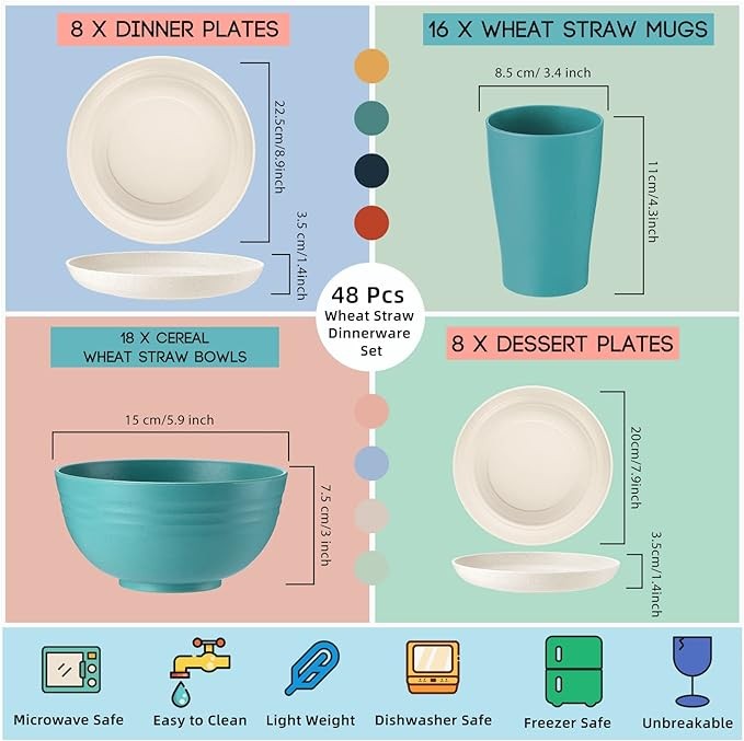 Lightweight and Anti Shatter: compared with ceramic tablewares, our wheat straw tableware set is more lightweight and not easy to break; These plate and bowl sets are drop and odorless, making them safe for everyone, and you don't need to worry about children breaking tableware