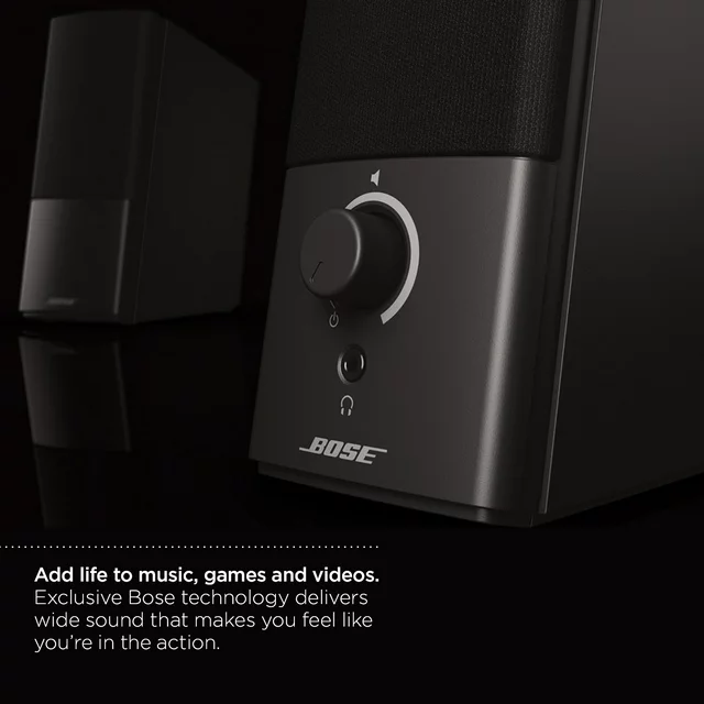 Don’t just play music, games and videos on your computer. With Bose Companion 2 Computer speaker system, you’ll be a part of the action with clear and high-quality sound like you never thought was possible from just two small speakers. This computer speaker system features exclusive Bose technology to produce balanced sound for a more immersive experience. Everything you need is in the box for a quick and easy connection to your desktop PC or laptop in minutes. It even has volume control and a convenient headphone jack on the right speaker for when you need private listening. Want to bring Bose performance to another audio source like an iPhone or iPad? No problem. The auxiliary input lets you expand your options. With the Bose Companion 2 computer speaker system, you won’t just hear your entertainment — you’ll feel it.