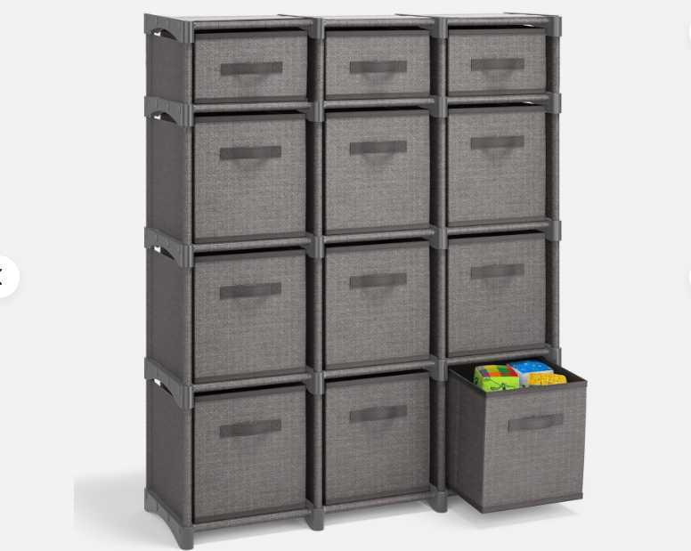 • 12 Cube Size Includes: 9 large bins measuring 10.4” L x 10.4” W x 11” H and 3 small bins measuring 10.4” L x 10.4” W x 5.3” H. Total dimensions 36.1” L x 11.9” D x 42.7” H.