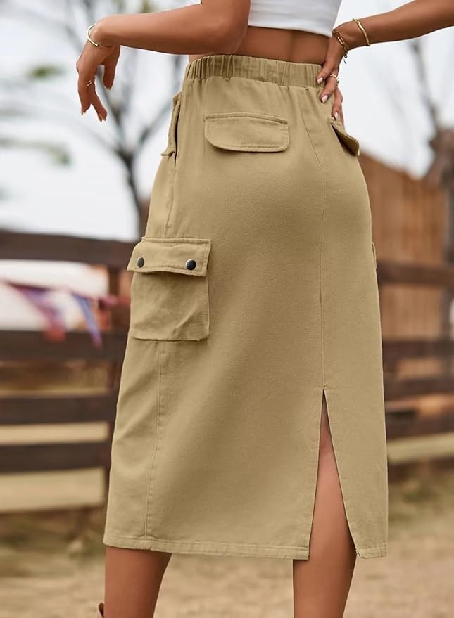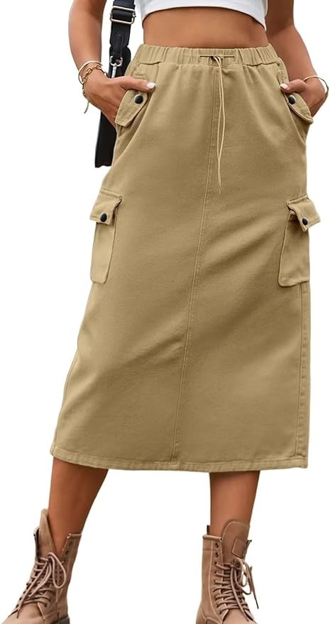 Dokotoo Women's Drawstring Waist Flap Pocket Cargo Skirt Back Slit Midi Skirt