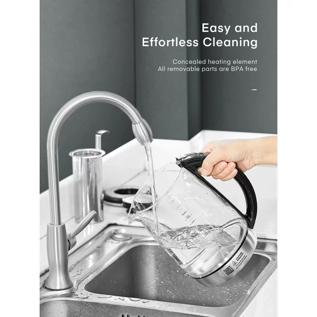 Fast Boiling & Removable Infuser: 1.7-liter borosilicate glass electric kettle has 1200 watts for fast heat up and a concealed heating element to prevent mineral buildup. A removable tea infuser allows you to place tea bags or loose tea leaves inside to infuse the water. Remove the filter basket once the required brewing time for the type of tea you are making is over to avoid over-infusing.