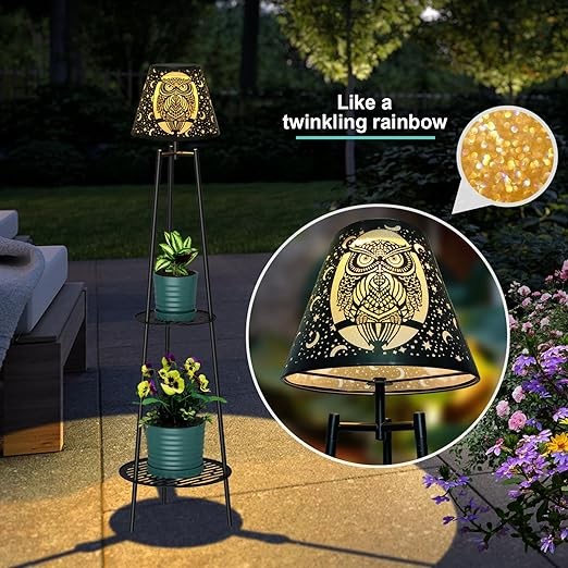 INNOVATIVE SOLAR STREET LIGHT: This solar street light gets rid of the monotony of the traditional street light, the lampshade part of the lampshade is so cute with the owl carved by the hollowing out technique. The structure of the lamp body adopts a triangular structure, and there are two plant shelves underneath. You can put flower pots or some other garden statues on the shelves to enrich the decoration of the terrace garden patio.
