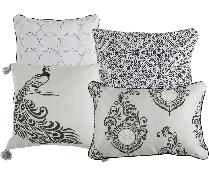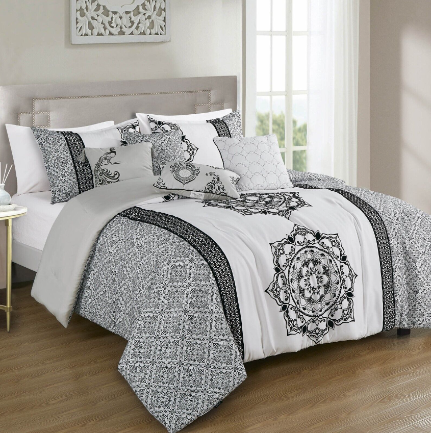 Features: A fashion forward comforter set with everything you need for a complete bedroom décor makeover. This luxury comforter set is a lavish and chic addition to any bedroom. They will transform your room into a charming and tranquil space. Specifications: Size: Queen/King Color Scheme: Gray/White Piece Count: 7