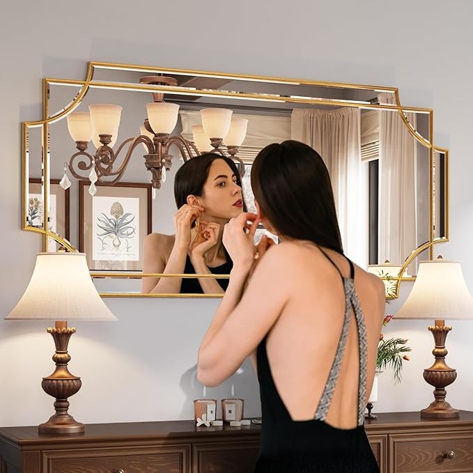 • GOLD FOIL FINISH. The mirror has a hand-applied gold foil finish. Its inherently textured detailing provides the mirror with unique character and charm. Whether you're using it as a wall art, vanity mirror or bathroom mirror, the large surface area allows it to brighten and expand any space it occupies. This mirror is also a perfect choice for your farmhouse makeover, fireplace mantle or bedroom furniture upgrade.