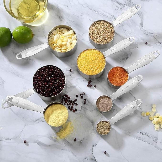 [Complete Set of 21] Includes 8 Measuring Cups (1/16 cup, 1/8 cup, 1/4 cup, 1/3 cup, 1/2 cup, 2/3 cup, 3/4 cup, 1 cup), 7 Measuring Spoons (1/8 tsp, 1/4 tsp, 1/2 tsp, 3/4 tsp, 1 tsp, 1/2 tbsp, 1 tbsp), 1 Leveler & 5 Mini Measuring Spoons (Tad, Dash, Pinch, Smidgen, Drop), totally 21 sizes to meet all your dry and liquid measuring needs.
