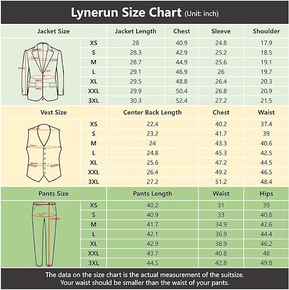 • 【SIZE SELECTION】: Please carefully check the Size Suggestion Table (2nd picture) and Lynerun Size Chart (3rd picture, the data on the picture is the actual measurement of the suit size, the error is within 1.2 inches) to avoid wasting time and money on returns. DO NOT look at the Amazon size chart. If you are not sure, we strongly recommend that you ask for the size first. You can tell us your height, weight, chest and waist circumference and we will figure out the best size for you.