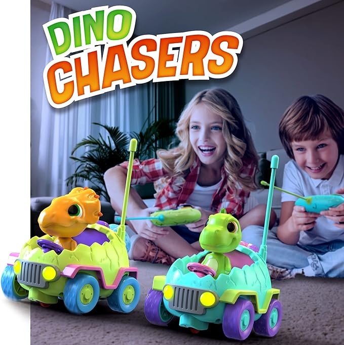 • We designed Dino Chasers as your child's first remote control toy car. The cars are easy to control with big button remote controls. They use independent frequencies, so they can race together! Remote Control Car toys for 4 year old boys, dinosaur toys for kids 3-5