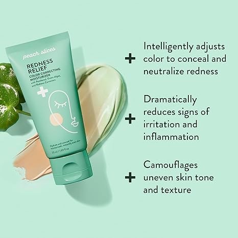Peach Slices Redness Relief Color Correcting Moisturizer instantly conceals and corrects redness while deeply moisturizing and calming skin. Clean Color Correcting Technology intelligently adjusts color to leave red, irritated skin looking even, and smooth.