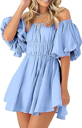 • SHOWING OFF YOUR CHARMING: This Babydoll Dress Features Short Puffy Sleeves, A Line, Ruched Bust And Empire Waist. The Puffy Sleeve Dress Can Be Worn In Different Style, Pulled Down For A Sexy Off-Shoulder Look, Or Pulled On As A Casual Square Neck Dress. The Elastic Waist Dress With The Delicate Ruffles, Shows The Body Curves Well, And Makes The Short Dress Full Of Elegance And Femininity