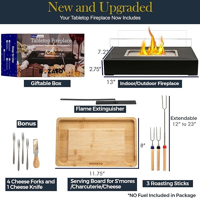 ROZATO Tabletop Fire Pit with Smores Maker Kit Portable Indoor/Outdoor Mini Small Fireplace Table Top Decor Home Patio Balcony Gifts for Women Mom Her Wedding Housewarming Mothers Day Birthday Gift