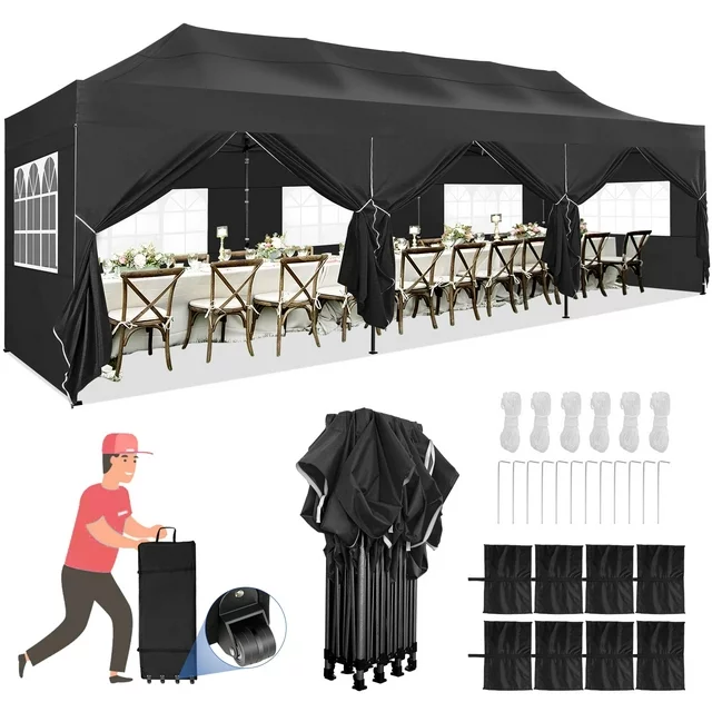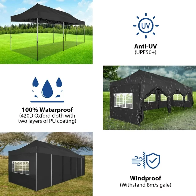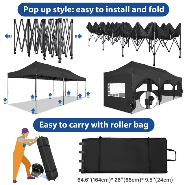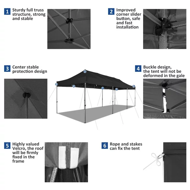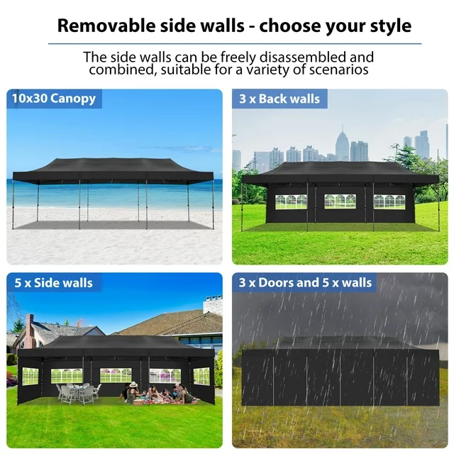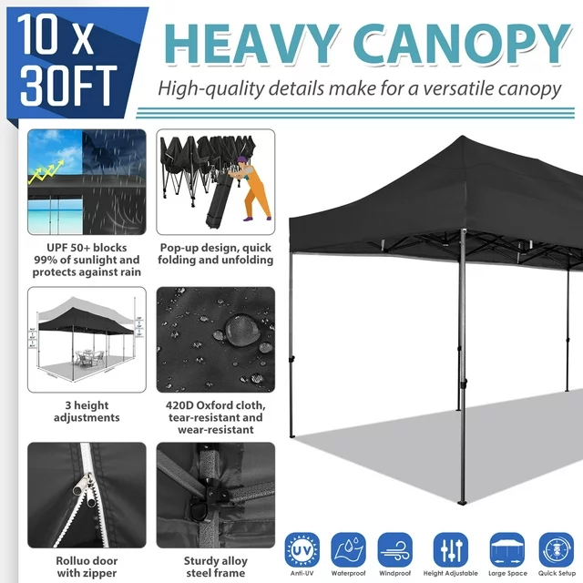?【Pop Up Easy Installation Canopy】: The 10x30 instant pop up gazebo tent can be quickly set up and taken down in half an hour. Equipped with detailed instructions and tutorials, two people can assemble or disassemble this canopy in half an hour without any tools, making it very convenient.