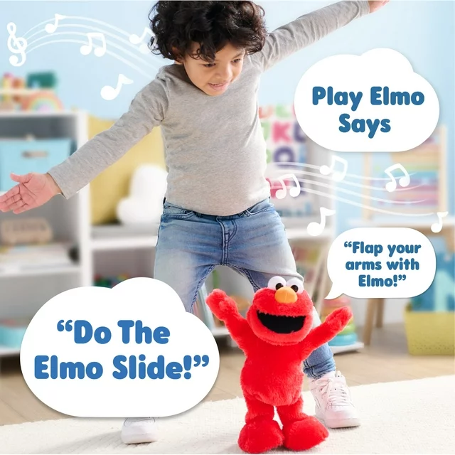 Includes: Elmo interactive plush toy., Dance and Sing Along with Elmo: The Sesame Street Elmo Slide plush toy dances and plays “The Elmo Slide” song and encourages kids to dance along. Children will love to move and groove to the popular dance routine as seen on Sesame Street and social media. Fun for the whole family!, 2 Modes of Play: Press Elmo’s left hand to activate "The Elmo Slide" song and dance moves. Elmo’s arms flap, his hips sway, and he slide from side to side. His mouth opens and closes as he sings and says fun phrases. Press Elmo's right hand to play the "Elmo Says" game. It's like "Simon Says," with Elmo leading the way., Elmo Habla en Español: Elmo speaks and sings in English and Spanish! This bilingual Sesame Street preschool toy features Elmo phrases and song in both languages. Just slide the switch under its foot to select., Active, Imaginative Play: Mimicking Elmo’s dance routine is a fun way for kids to get some exercise, while also inspiring them to invent awesome moves of their own., Sustainable Plush Stuffed Animal: This 14-inch Elmo plush toy is made with cuddly soft fabrics and is stuffed with 100% recycled fill for less impact on the environment. Elmo slides on smooth surfaces., The Sesame Street Elmo Slide plushie is ideeal for kids ages 2 years and up., 4 x AA batteries required (included).