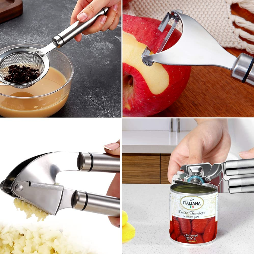 • : It includes slotted spatula, slotted spoon, flexible spatula, slotted Turner, solid turner, pasta server, solid spoon, kitchen tongs, draining spoon, whisk, deep soup ladle, spatulas and brush. A complete set that meets your daily needs.