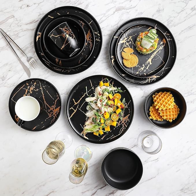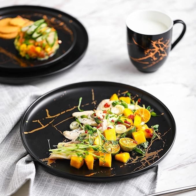 16 Piece Dinnerware Set – Sleek black porcelain dining sets, with a hot splash of gold. Includes 4 round dinner plates, 4 salad plates, 4 bowls and 4 mugs