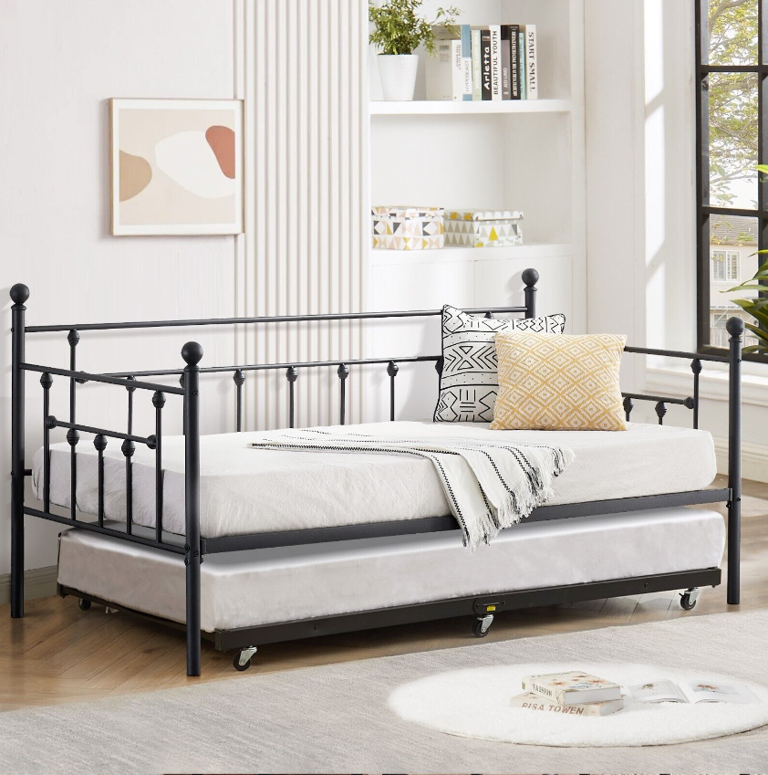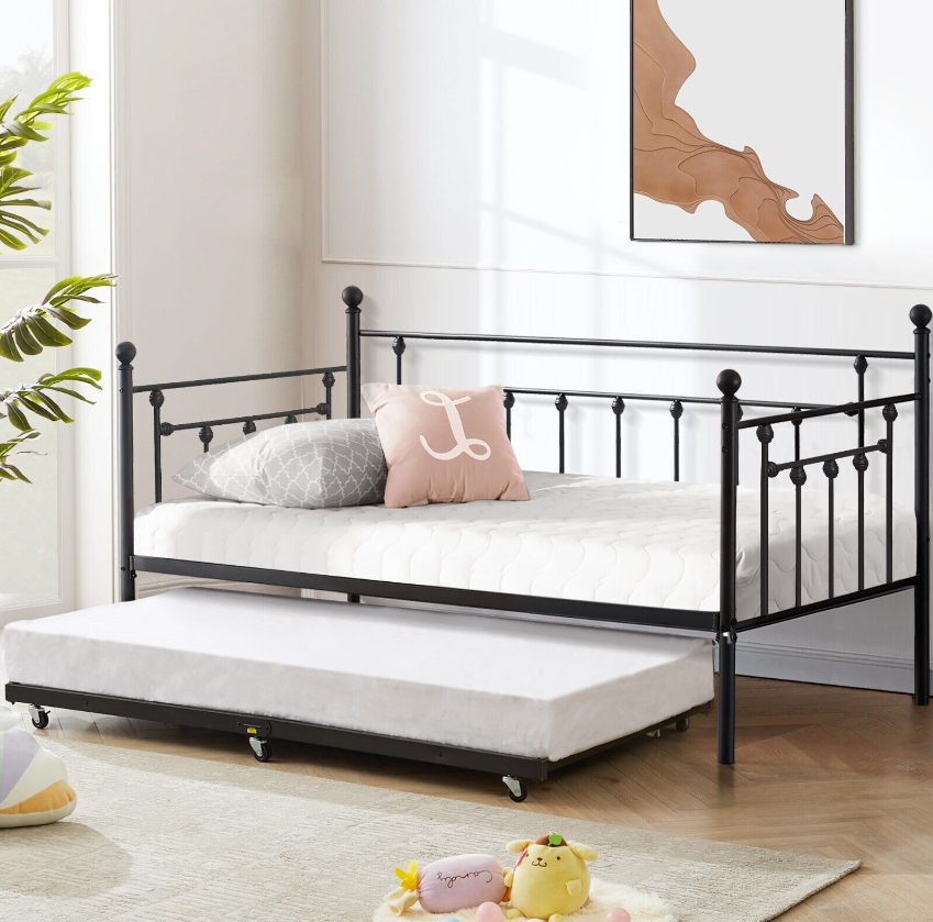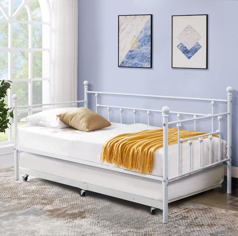 Twin Size Daybed Metal Bed Frame Trundle Sofa Bed Steel Slat Support Headboard