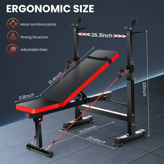 4 in 1-Piece Set Multifunctional Exercise Equipment - Designed for versatility. Includes 1 VIBESPARK Olympic Weight Bench, and 1 Weight Lifting Rack for full body strength training, such as Flat Bench Presses/Incline Dumbbell Bench Press/One-Arm Dumbbell Preacher Curl, etc. With two pull-up grips to exercise arm muscles, the supine board allows you to exercise abdominal and leg muscles. You would also get 2 resistance bands as attachments, the bands will be a great assistant for your effective fitness or weight loss programs, no matter if you are a beginner or an expert, the bands will meet your needs.
