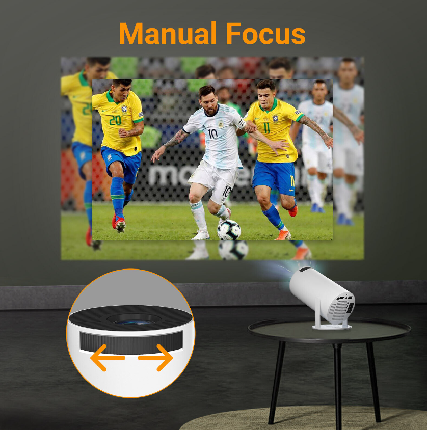 Adjustable 180° projection angle, allowing you to rotate it to any angle to play video or picture. Supporting automatic correction and manual focus.